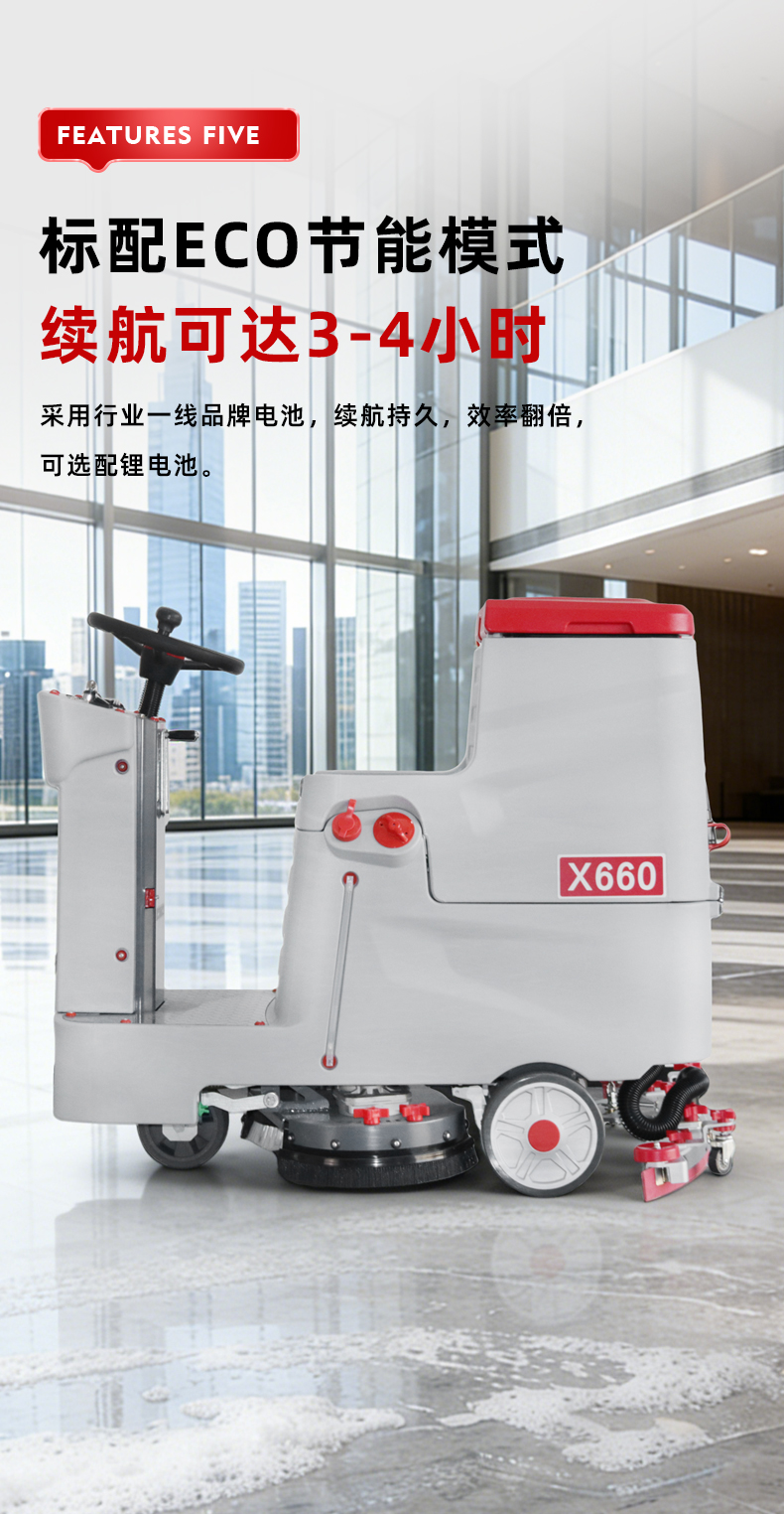 坦洁驾驶式洗地机X660产品介绍一、产品概述​产品简介:坦洁驾驶式洗地机X660整机设计美观大气,操作简单易上手,一台机器可代替8-9人,适用于物业、医院、工厂、仓库、机场、车库等小面积室内场景地面清洁作业。产品定位:适用于中大型工厂、物流仓库、商场超市等大面积硬质地面清洁场景,满足企业对高效、深度清洁的需求。设计理念:秉持人性化设计理念,注重操作便捷